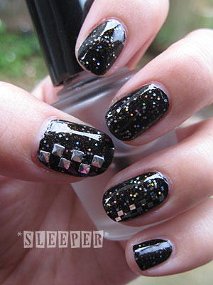 ・薬指にスクエアホロ(シルバー/1㎜)、親指にスクエアスタッズ(シルバー/2㎜)を縦に市松模様に並べる。