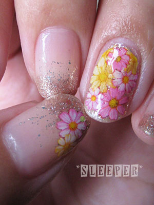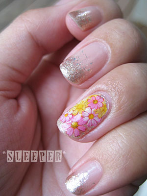 ・親指にコスモスシールを貼り、丸ホロ(オーロラクリアイエロー)を散らす