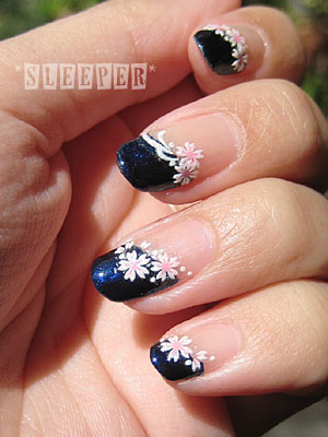 ・親指と中指にカメリアのシールを貼り、逆フレンチラインに丸ホロ(ブラック/1mm)を並べる
